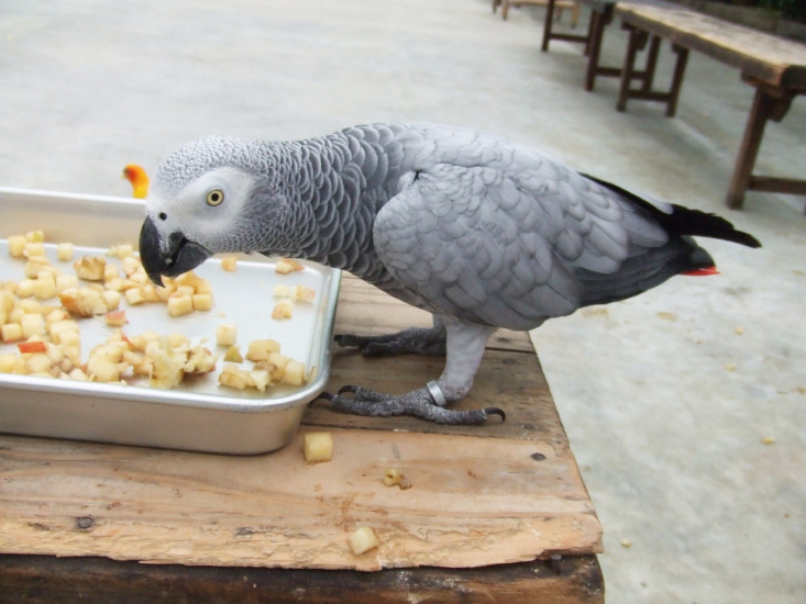 昼間は木の上の方にいたヨウムさんも降りてきてご飯を食べていました。