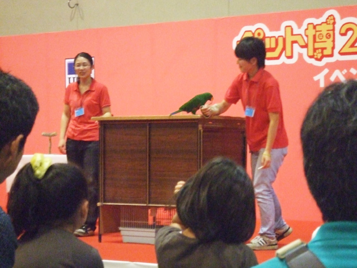 室内のコンゴウインコショーは、前までは端っこでやっていたためお客さんが少ないことが多かったのですが、スペースも広くなり多くの方が集まっていました。